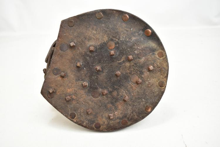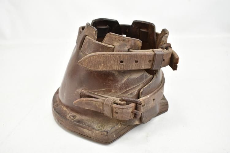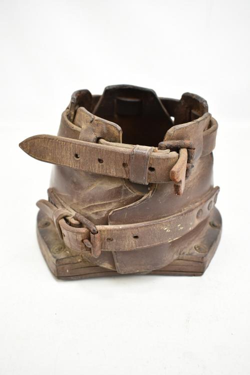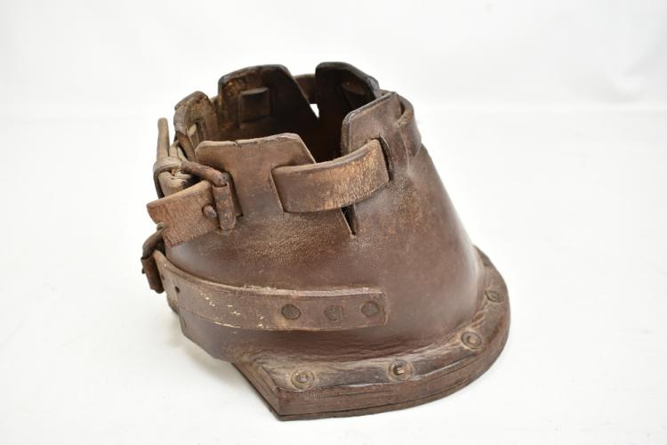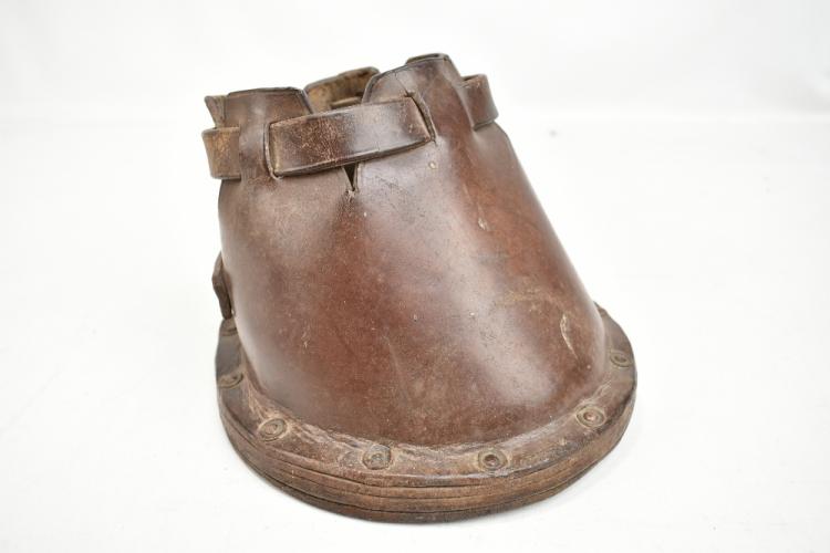 Lot 34 of 1228: A 19th century horse's leather shoe cover used when mowing cricket pitches, 16 x 20cm.