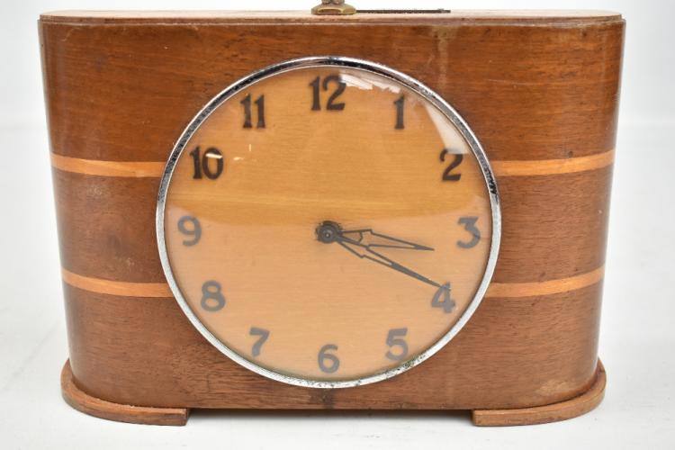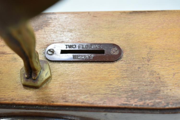 Lot 35 of 1228: A rare Art Deco combination money box and clock with bronzed figural finial, the circular dial set with Arabic numerals, the coin aperture inscribed 'Two Florins Weekly', 33 x 28cm. These clocks where produced to encourage saving - a florin had to be inserted into the money box before the clock would function.
