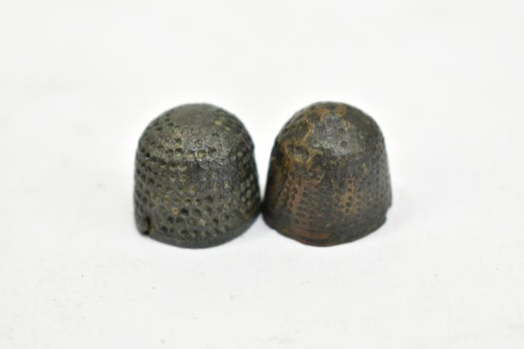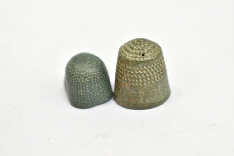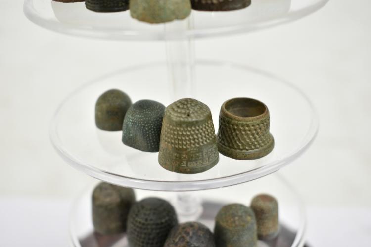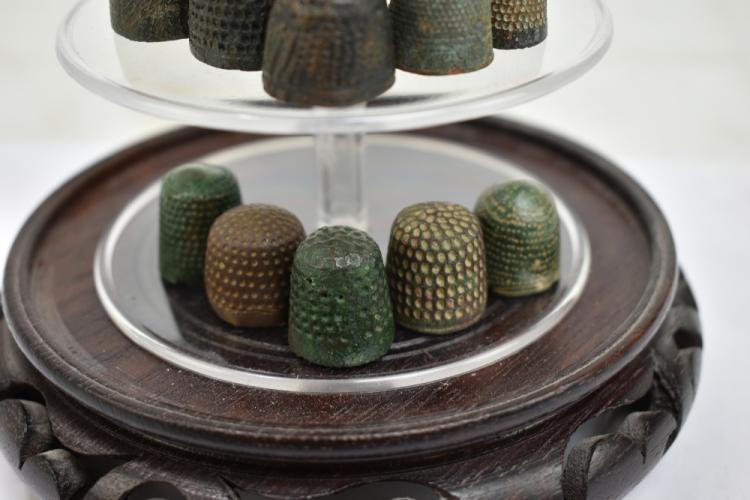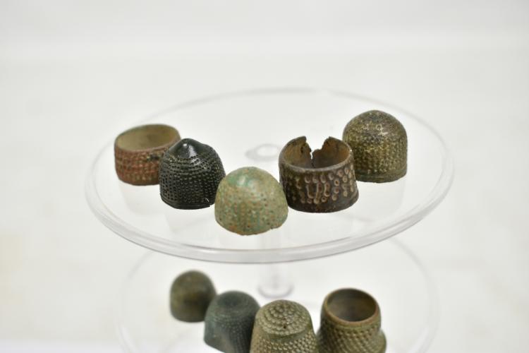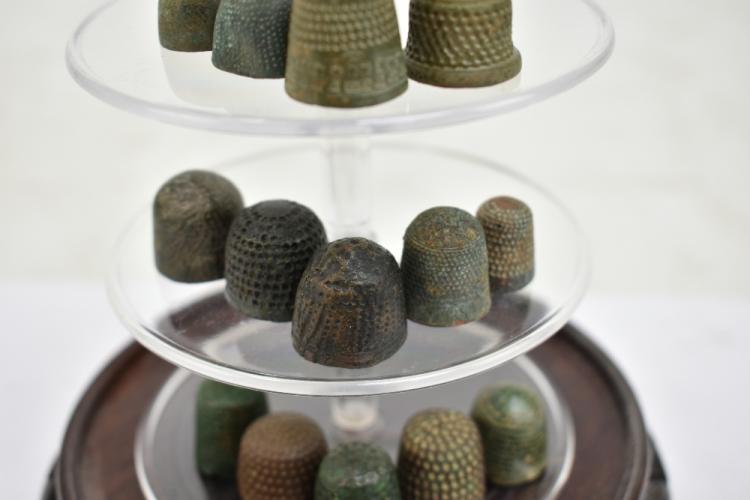 Lot 52 of 1228: A group of Medieval-17th century thimbles and two tailor's rings, housed beneath perspex dome on carved hardwood stand.