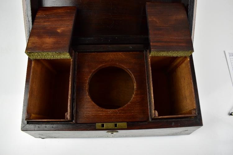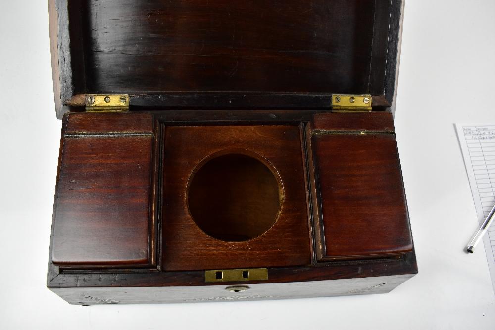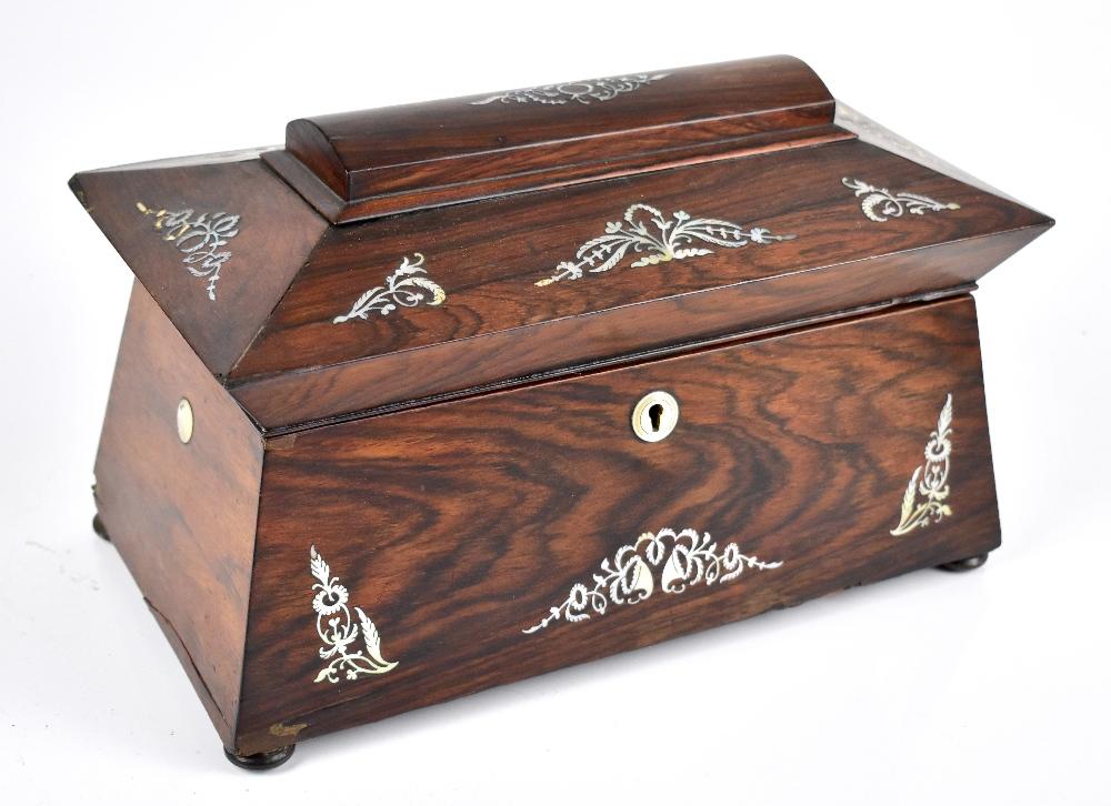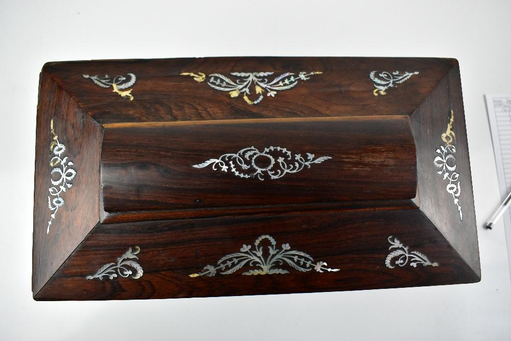 Lot 59 of 1228: A 19th century rosewood mother of pearl inlaid sarcophagus form tea caddy with two lidded compartments and vacant jar compartment to interior, on four compressed bun feet, approx 20 x 34 x 18.5cm.