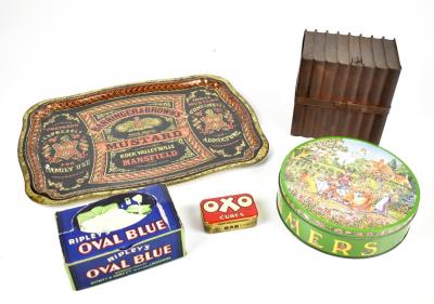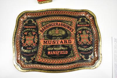 Lot 63 of 1228: A collection of assorted advertising to include a rectangular tray 'Barringer & Brown's Prize Medal Mustard', 32 x 43cm, Huntley & Palmers novelty book tin etc (5).