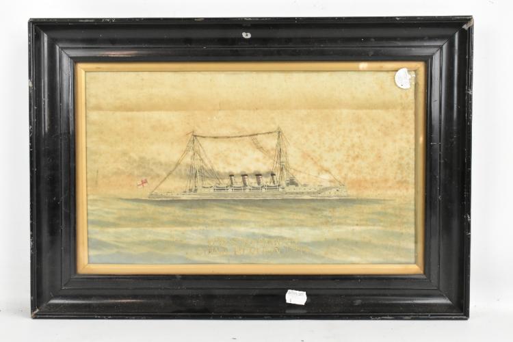 Lot 253 of 1228: An early 20th century needlework on silk, 'H.M.S Yarmouth, China Station 1918', 24 x 40.5cm (af).