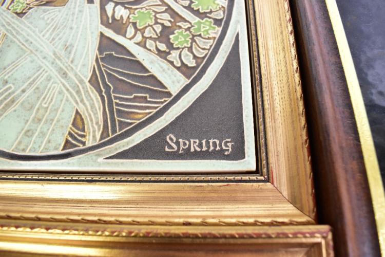 Lot 327 of 1228: MAW & CO; nine reproduction majolica-type tube line decorated tiles comprising three larger rectangular examples, 59 x 19cm, and two sets of three square examples including three titled 'Spring', 'Summer' and 'Autumn', each 20 x 20cm, all framed (9).