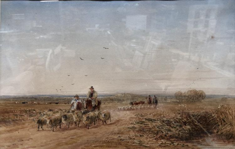 Lot 790 of 1228: DAVID COX SNR, OWS (1783-1859); watercolour, rural farming scene, shepherds in the foreground with coastal scene in the background, gallery labels verso with provenance: Robert D Holt-Agnews Liverpool, exhibited Liverpool Art Club 1875, 25.5 x 35.5cm, framed and glazed.