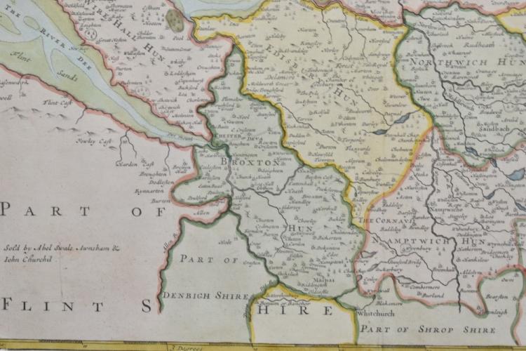Lot 797 of 1228: ROBERT MORDEN; an 18th century and later hand coloured map 'The County Palatine of Chester', 34.5 x 41.5cm, framed and glazed.