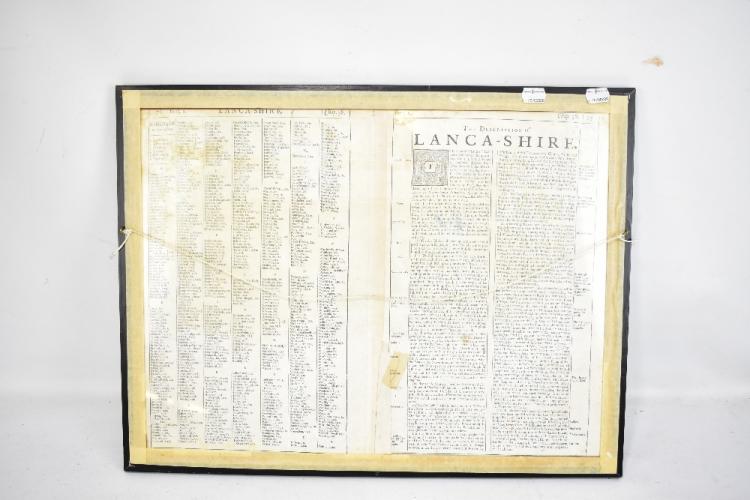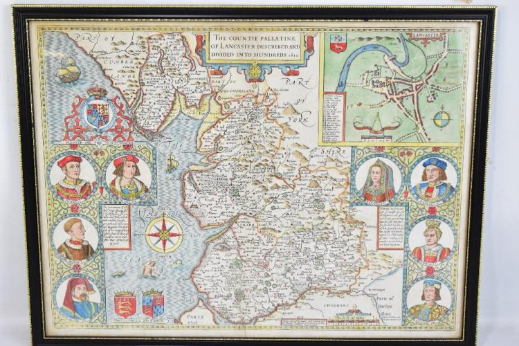 Lot 800 of 1228: JOHN SPEED (1552-1629); 'The Countie Pallatine of Lancaster Described and Divided into Hundreds 1610', hand coloured map, 40 x 53cm, framed and glazed.