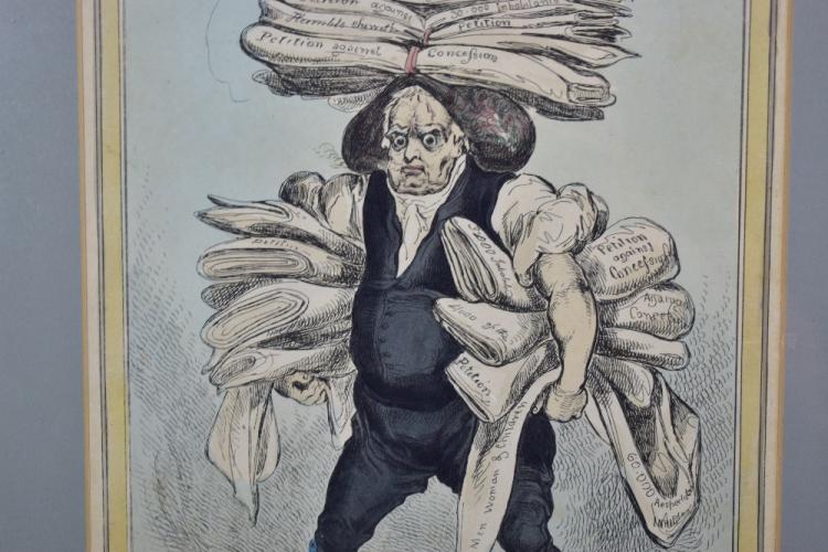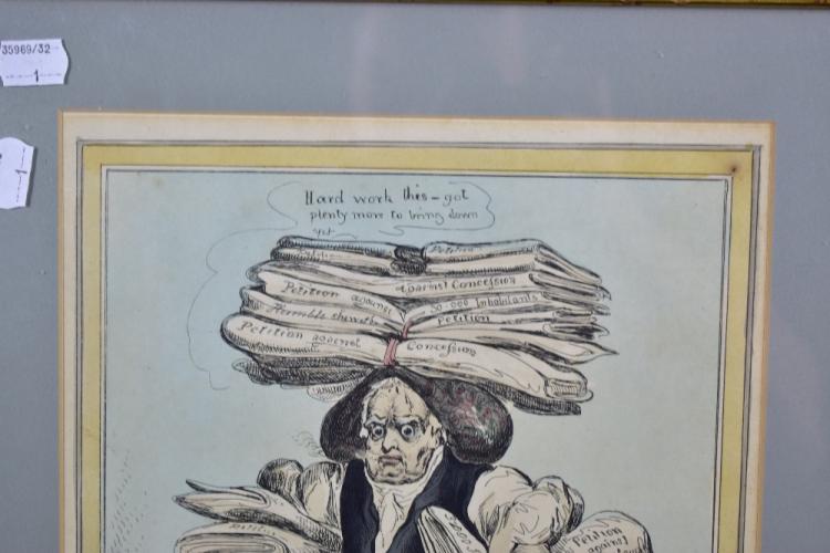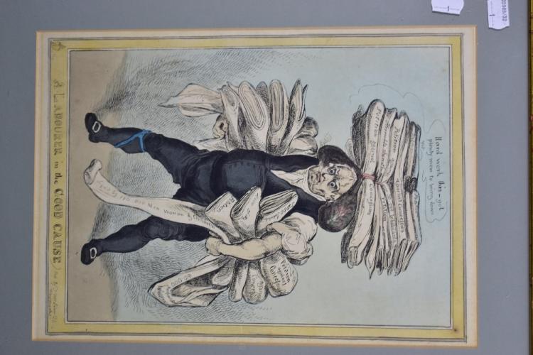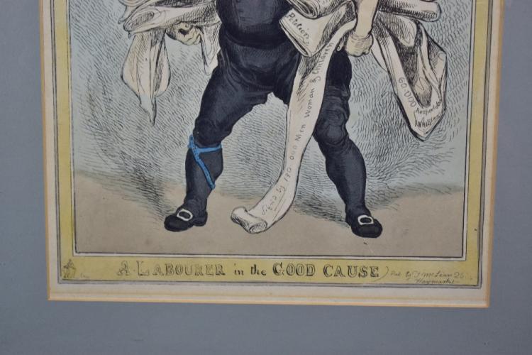 Lot 809 of 1228: AFTER THOMAS MCLEAN; a coloured caricature engraving, 'A Labourer in a Good Cause', published by Thomas McLean 26 Haymarket, 36 x 25.5cm, framed and glazed.
