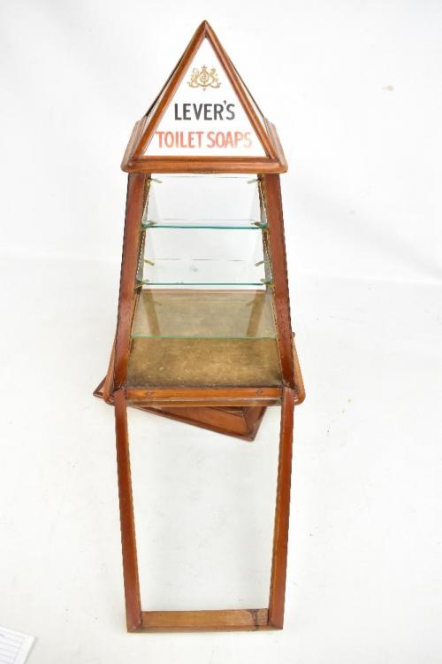 Lot 3A of 1228: LEVER BROTHERS; a mahogany advertising rotating shop display cabinet on stand, tapering form, with four advertising panels on top section and single hinged door, height 60cm, width 33cm.