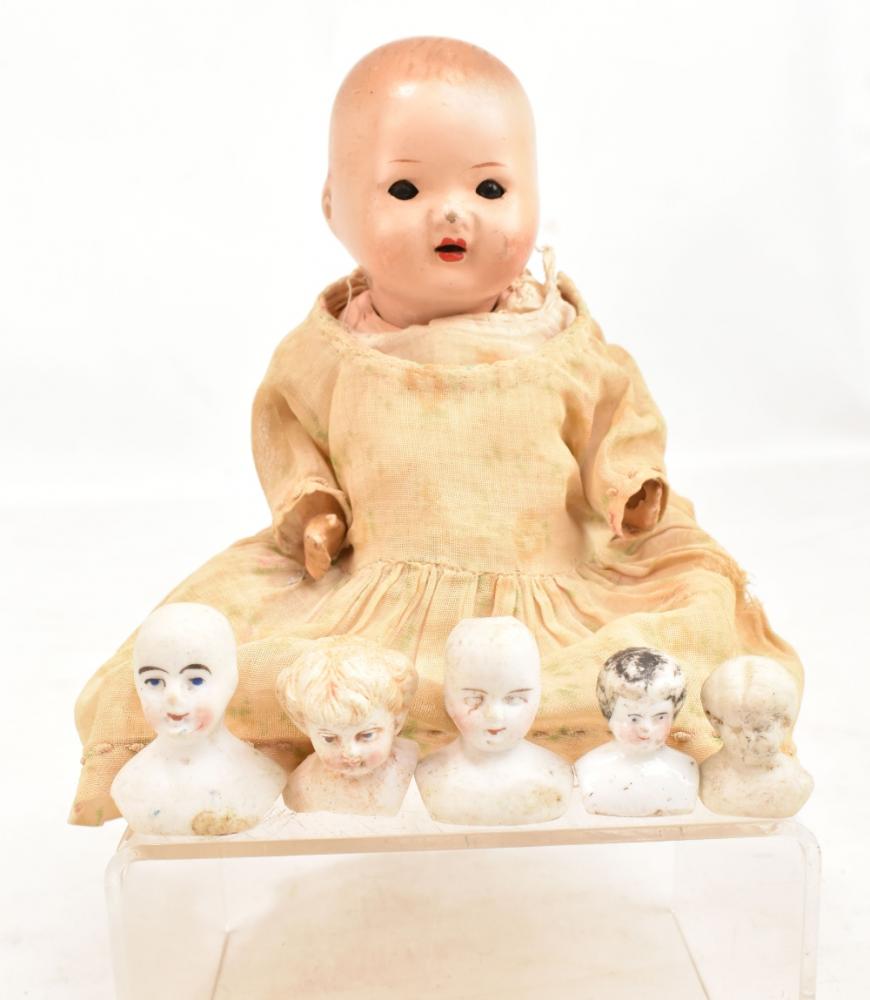 Lot 235A of 1228: A German wax headed doll with articulated arms and legs, marked A. Germany to head, length is 16cm, together with six pin cushion dolls heads, (part af).