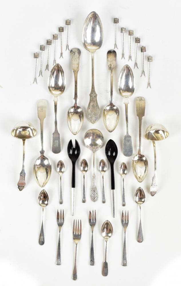 Lot 1342 of 1529: NETTER; two German 800 grade tablespoons with engraved initials 'H' to handles, and further 750 and 800 grade flatware, approx 21.4ozt/665.6g.