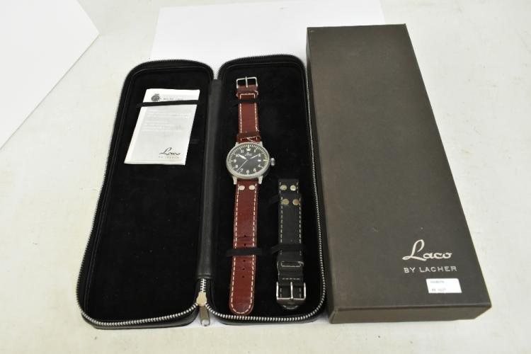 Lot 12 of 1529: LACO BY LACHER; a gentleman's pilots stainless steel wristwatch, ETA 2824-2, with twenty-five jewel movement, the circular dial set with Arabic numerals and date aperture, sold with current maroon strap and correct buckle and spare black strap with correct buckle and the specification booklet for the watch, in leather case and original outer box, diameter excluding winding crown 43mm.