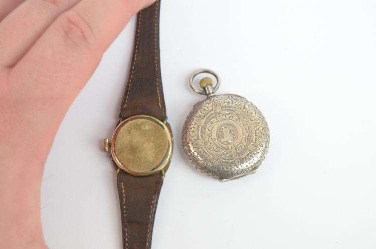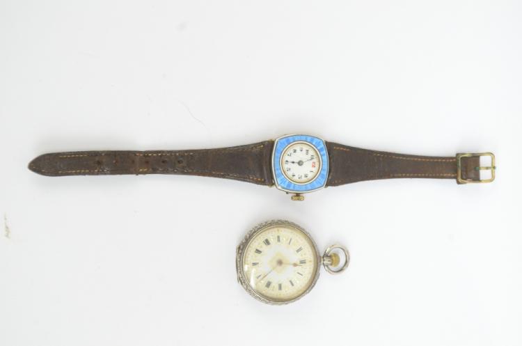 Lot 53 of 1529: A 1930s gold plated lady's wristwatch with blue guilloche decorated frame and white enamel dial set with Arabic numerals, also a engraved silver fob watch with enamel dial (2).