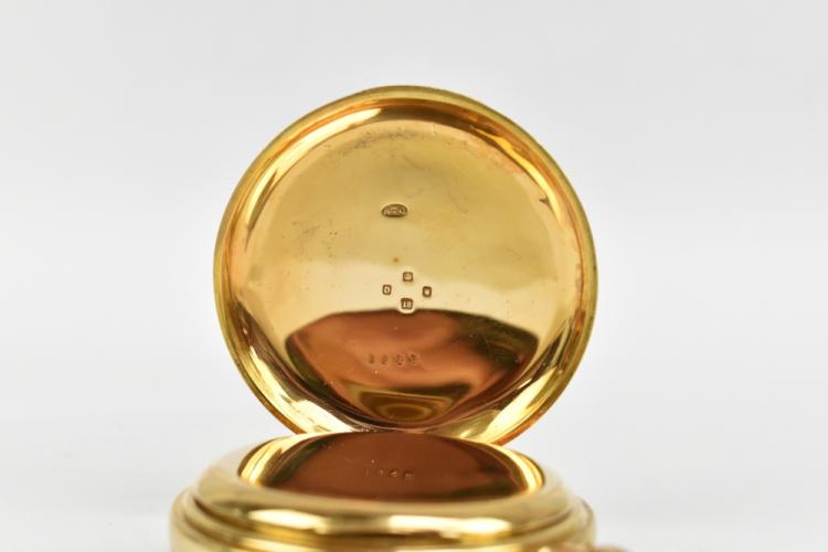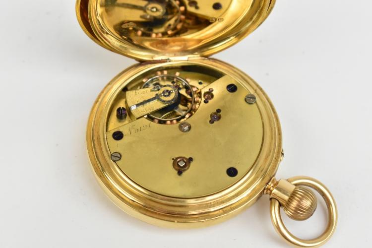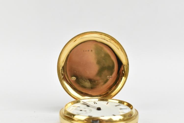 Lot 60 of 1529: An Edwardian 18ct yellow gold crown wind full hunter pocket watch, the white enamel dial set with Roman numerals and subsidiary seconds hand, with unnamed movement numbered N.9124, Sheffield 1906 diameter 52mm, approx 126g.