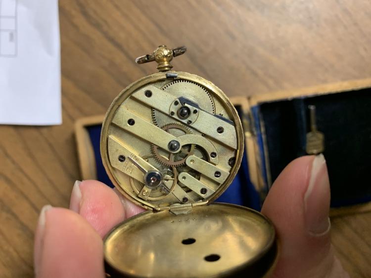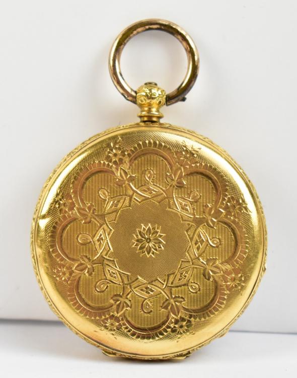 Lot 62 of 1529: A lady's 18ct gold pocket watch, the circular dial set with Roman numerals and central filigree decoration, indistinct retailer's mark to dial, diameter 40mm, approx 41.6g.
