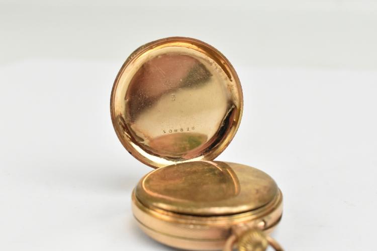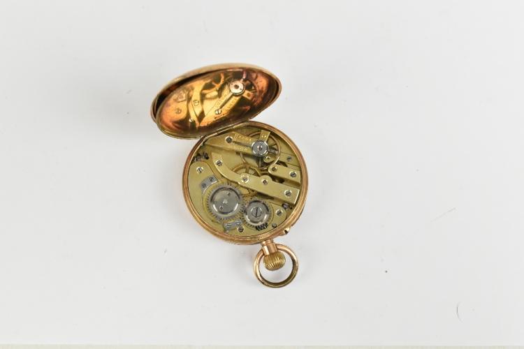 Lot 65 of 1529: A 14ct yellow gold lady's crown wind fob watch, with Roman numerals to the chapter ring and engraved central decoration to the dial, diameter 40mm, approx 44.3g.