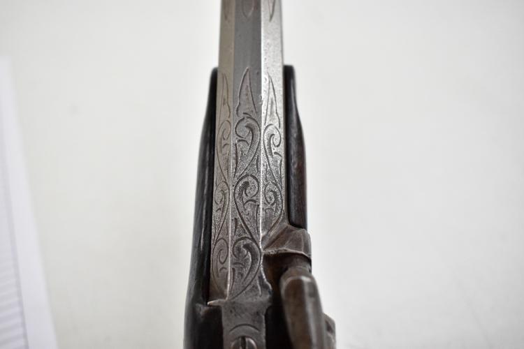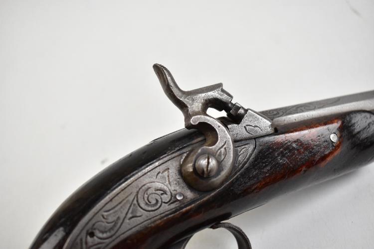 Lot 3 of 679: An early 19th century percussion cap pocket pistol with engraved detail to the lock plate and barrel, length 20cm.