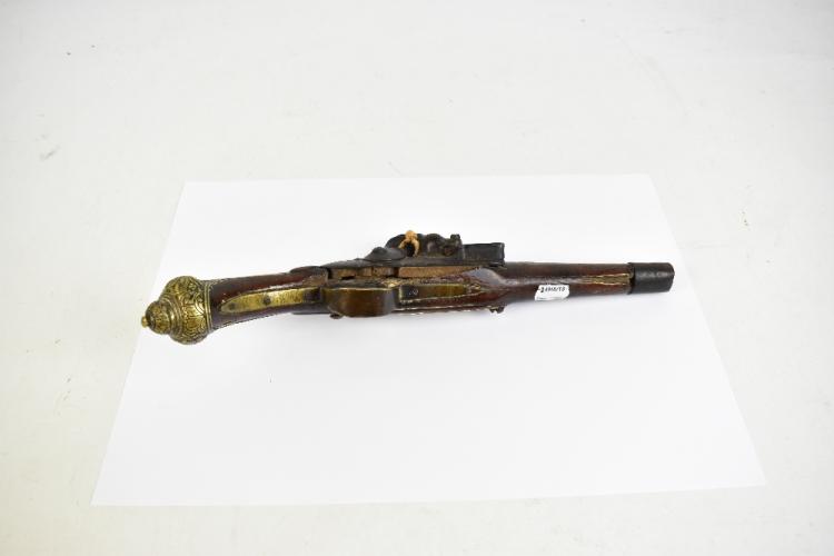 Lot 5 of 679: A late 18th/early 19th century Eastern walnut stocked and brass mounted flintlock pistol, length approx 37cm (af).