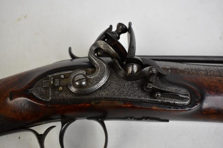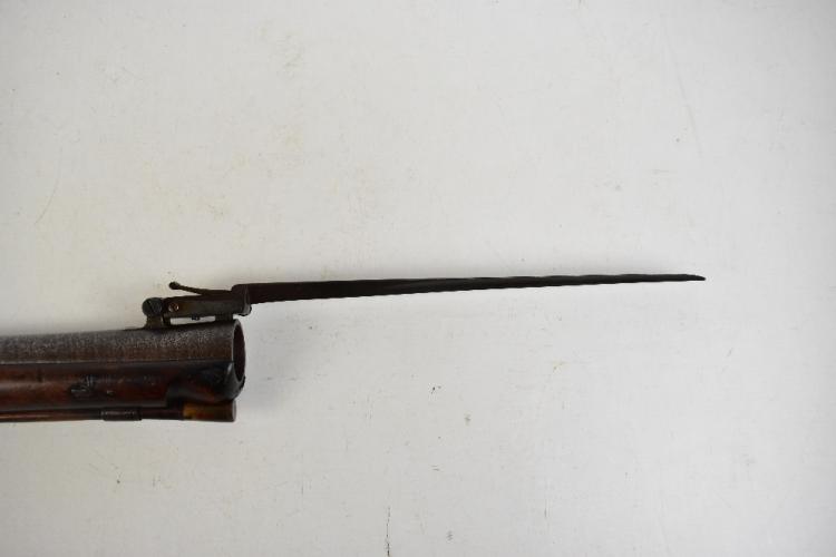 Lot 10 of 679: A 19th century walnut stocked blunderbuss with spring loaded bayonet, the lock plate inscribed 'Simmons', with checkered decoration and steel furniture, length 75cm.