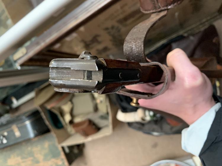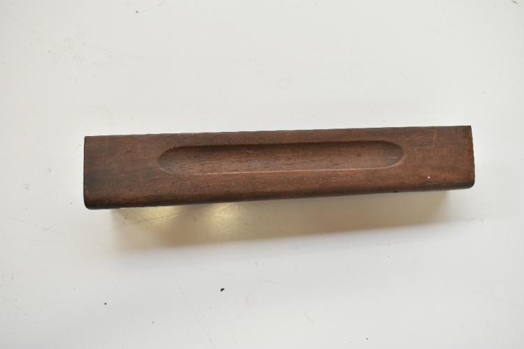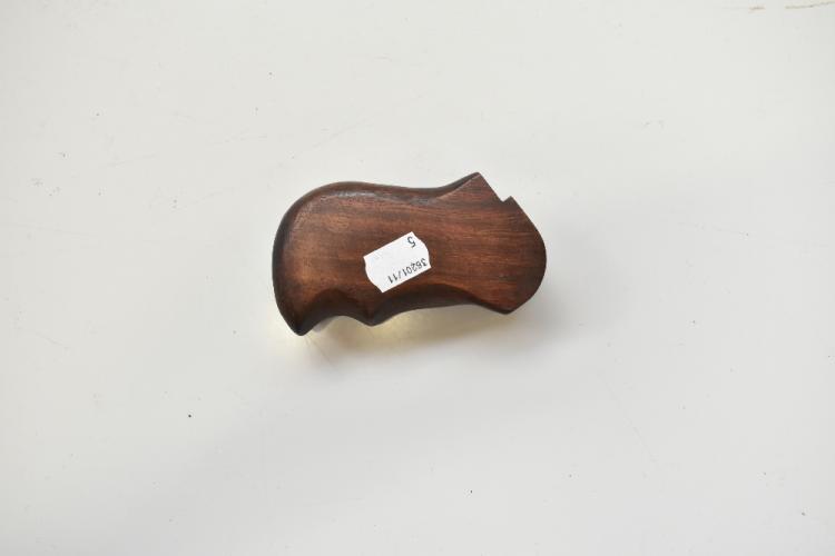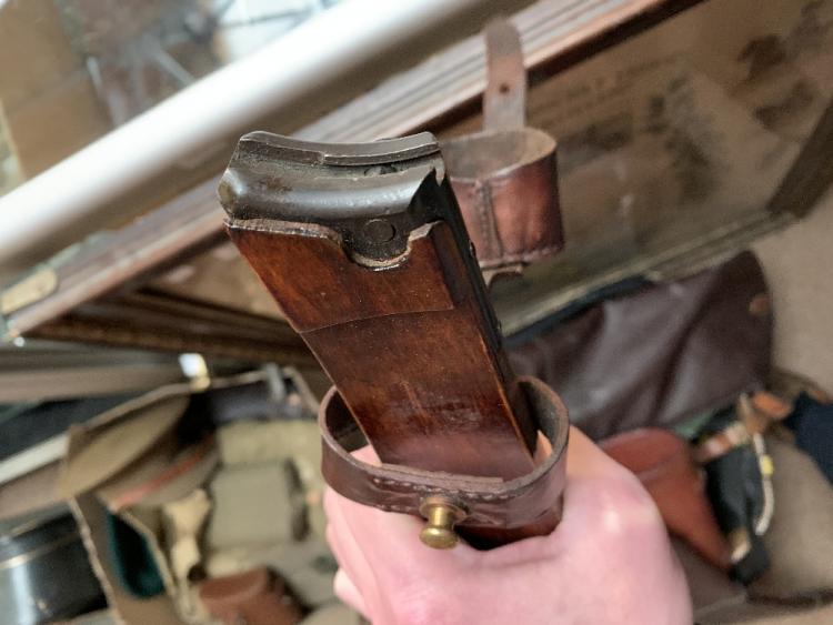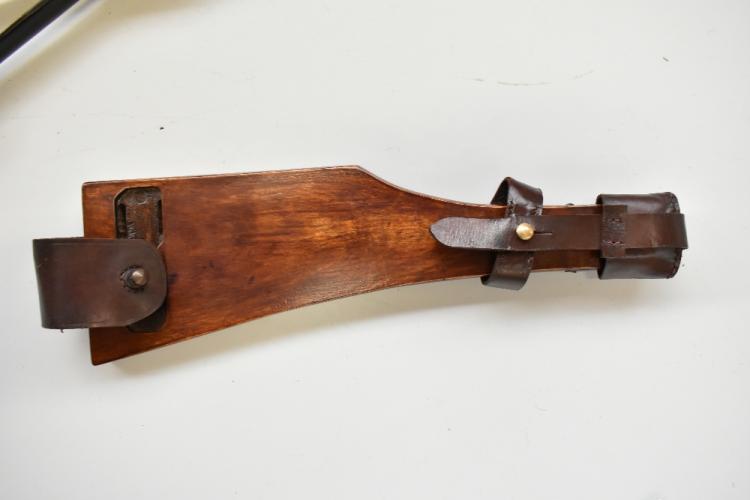 Lot 13 of 679: Two handgun stock attachments including a stained wooden example with leather fasteners, length 35cm, also a wooden stock and grips, possibly for a Thompson sub-machine gun (5).