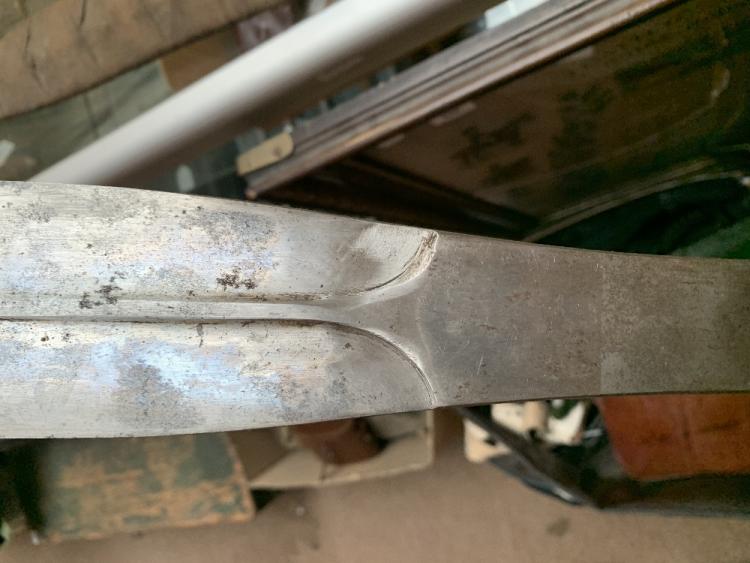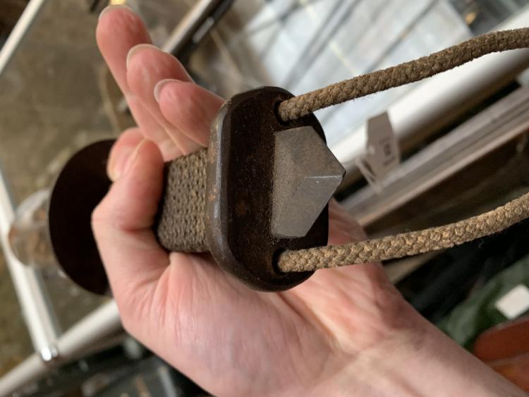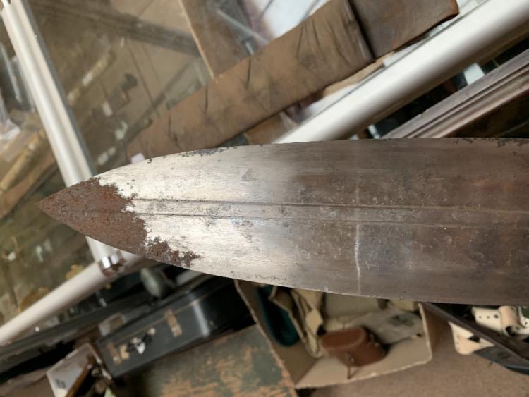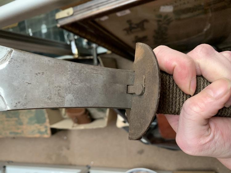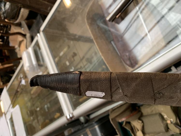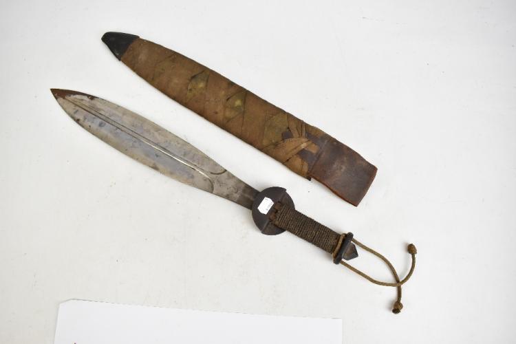 Lot 23 of 679: A WWI Welsh trench fighting knife with typical swollen blade, after the model designed by Felix Joubert, unmarked, with hinged circular guard and cord wrapped grip, length of blade 44.5cm, in wrapped leather scabbard.