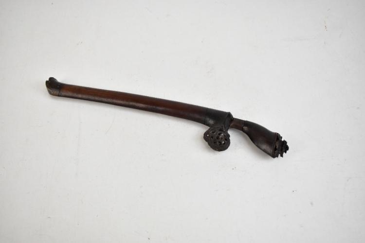 Lot 25 of 679: A Sumatran bade-bade dagger in wooden sheath with carved horn handle, length 36cm.