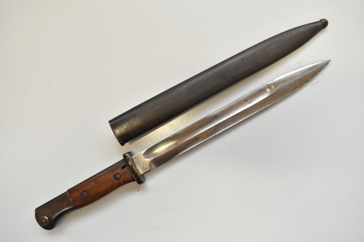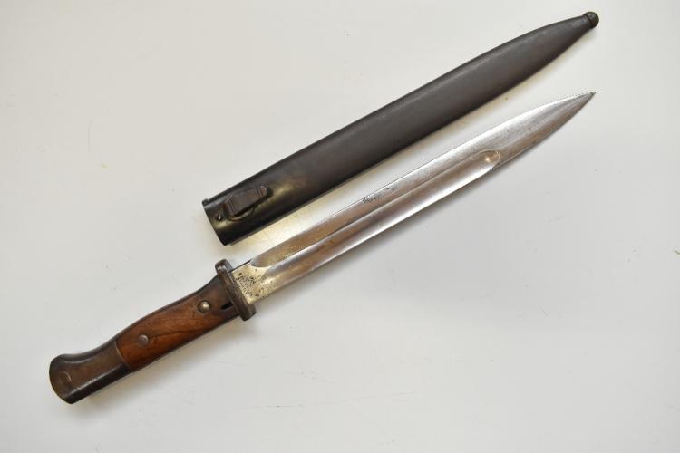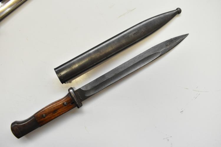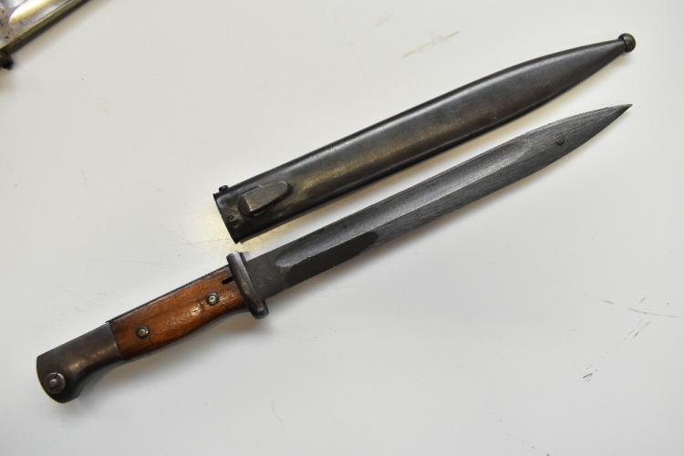 Lot 34 of 679: F. HERDER; a WWI period Walter & Co bayonet and scabbard, length 40.5cm, two further bayonets and scabbards, one with impressed no. 6003, and a steel and leather scabbard (4).