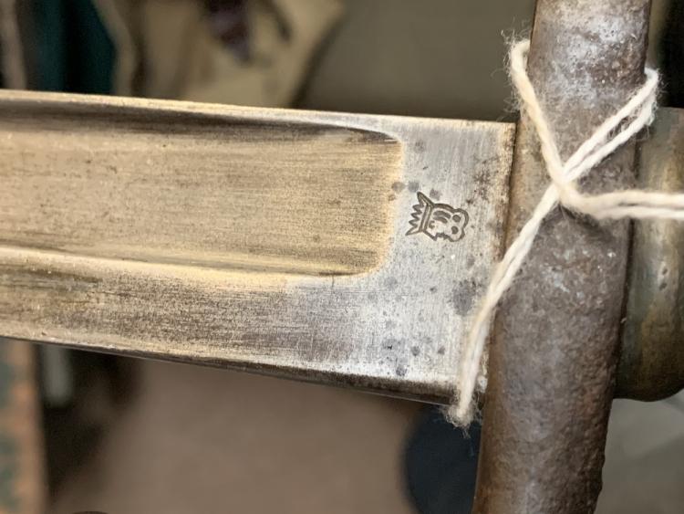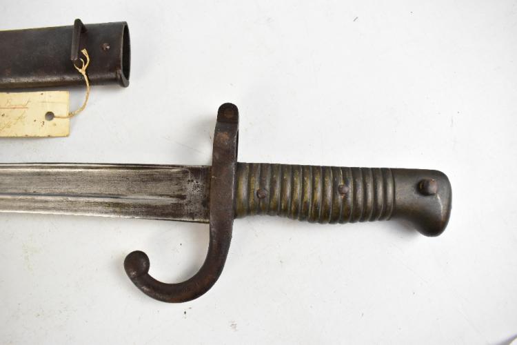 Lot 38 of 679: A 19th century French chassepot bayonet with ribbed brass grip and scabbard, length of blade 57cm, overall length 70cm.