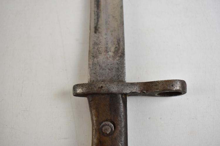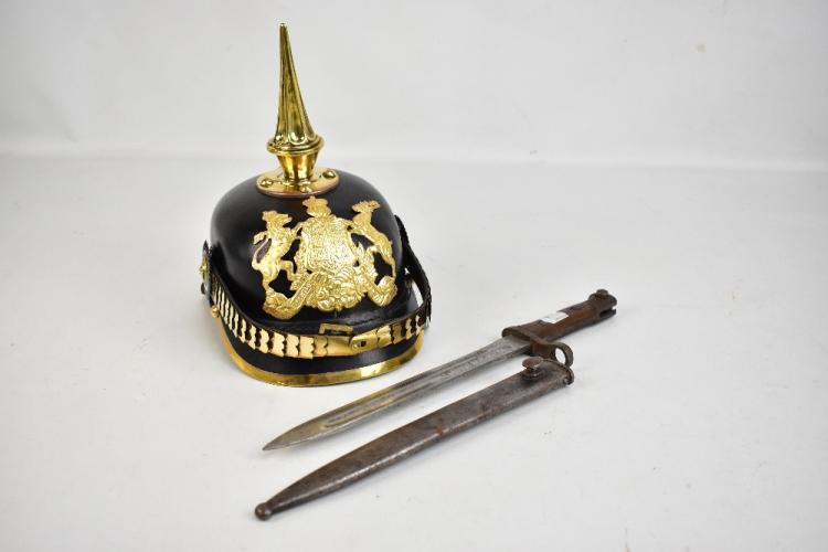 Lot 42 of 679: A WWI period bayonet of German manufacture, the blade signed 'Weyersberg [...] Solingen', the quillon numbered 3874, in metal scabbard, length 39cm, and a reproduction Prussian-style pickelhaube (2).