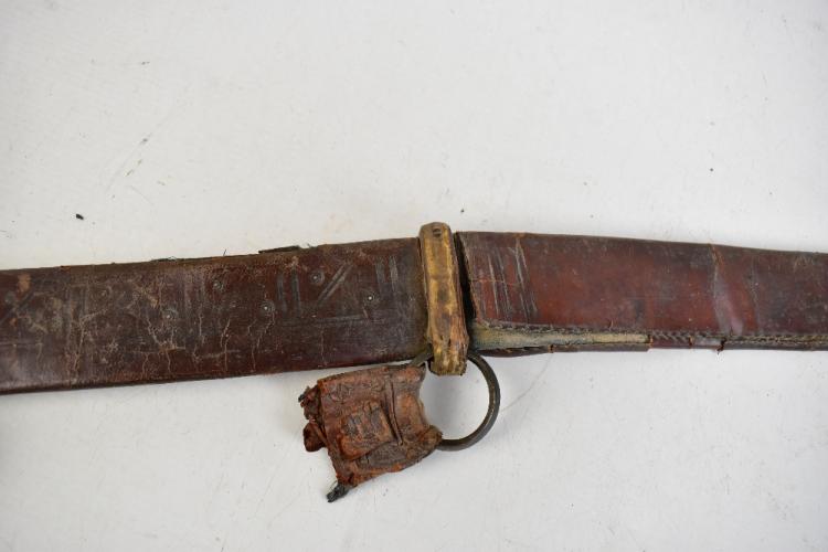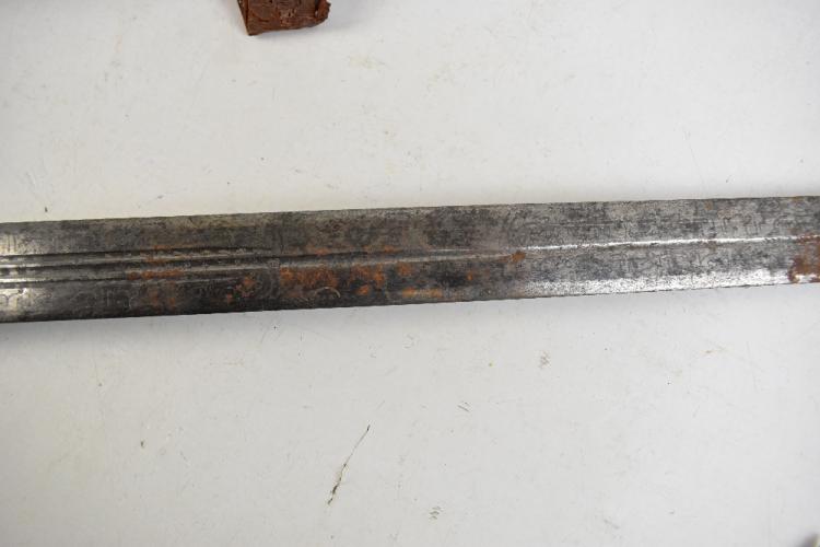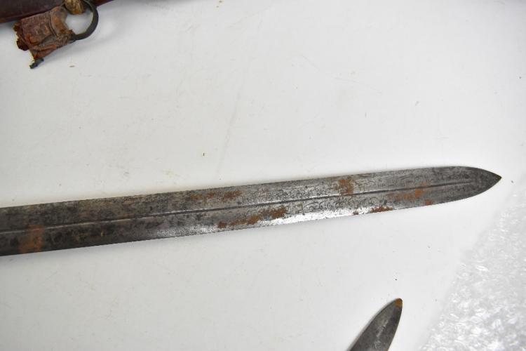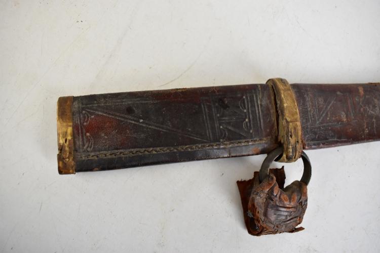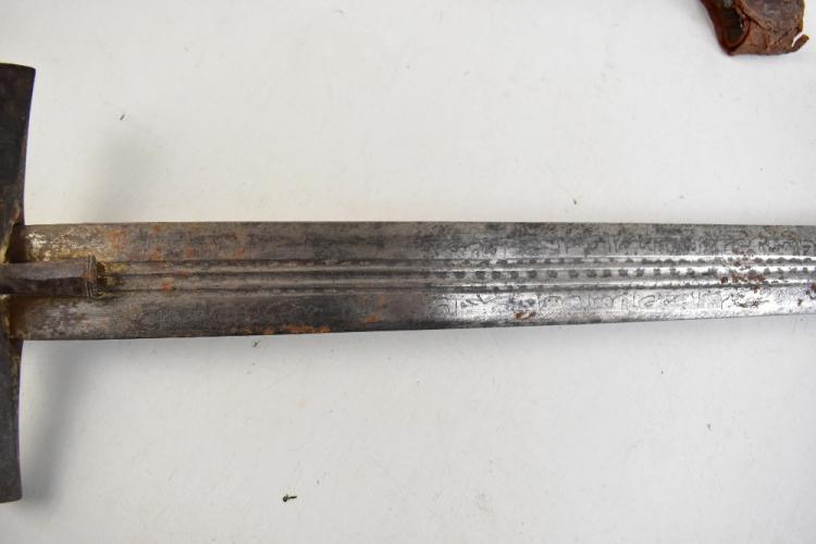 Lot 44 of 679: A Sudanese kaskara, the fullered blade with engraved Arabic script to both sides, length of blade 82cm, with cross hilt in leather scabbard (scabbard af).
