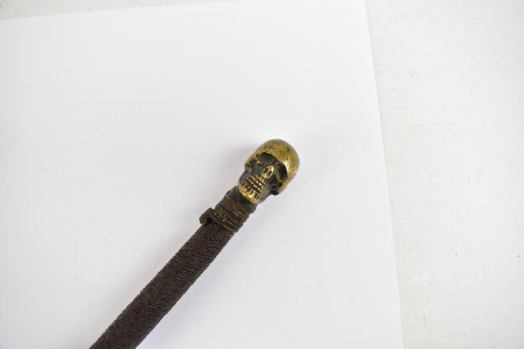 Lot 45 of 679: A Masonic-type sword, the thin blade with etched cross and foliate detail to both sides, indistinctly signed 'Re[...]ing London Liverpool g[...]', length of blade 69.5cm, with wire work grip with brass skull pommel, in brass mounted leather scabbard (scabbard af).