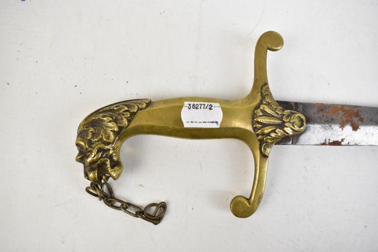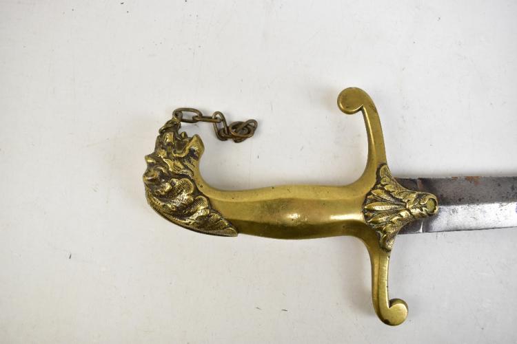 Lot 46 of 679: A 19th century short sword (probably naval), the brass hilt with cast foliate detail and lion head pommel, length of blade 52cm.