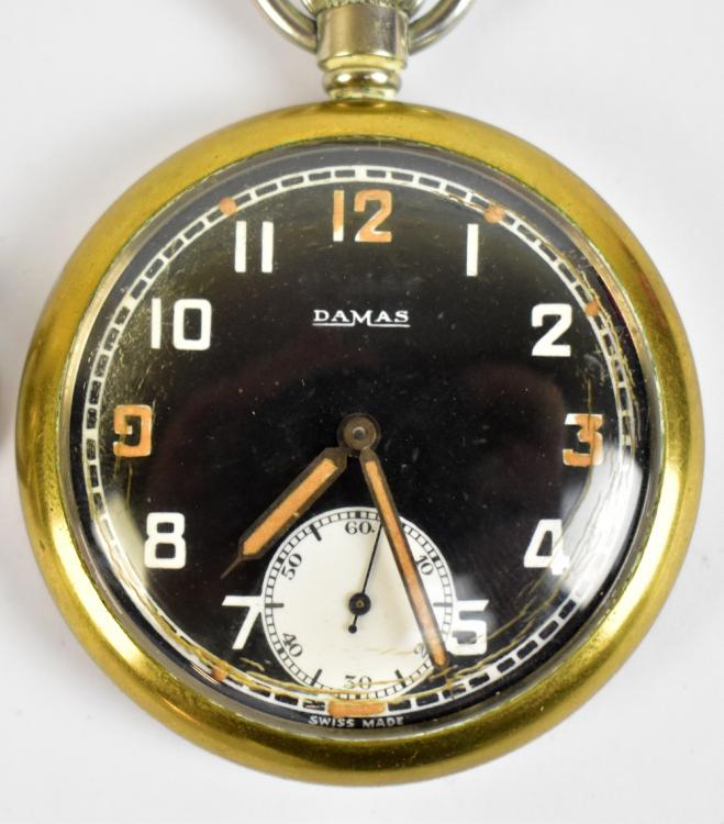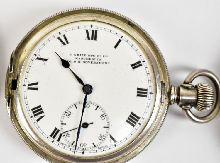 Lot 57 of 679: DAMAS; a WWII period base metal military screw wind pocket watch, the dial set with Arabic numerals and subsidiary seconds dial, diameter of case 50mm, impressed marks 'G.S./T.PXX368498' with broad arrow to case back, and a silver plated full hunter pocket watch marked 'H White MPG Manchester to HM Government', the circular dial set with Roman numerals and subsidiary seconds dial, diameter of case 50mm (af) (2).