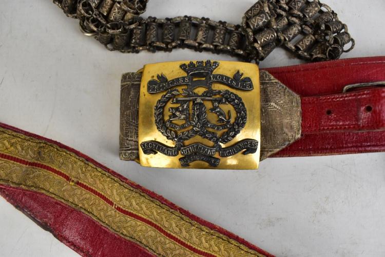 Lot 60 of 679: A maroon leather, silk and brass belt with buckle inscribed 'Princess Louisa's Argyle and Sutherland Highlanders 1st Renfrew', a further maroon leather and metal mounted belt with buckle inscribed 'New York Constantine Commandery No.48', a gold thread and Morocco leather belt and a single brass shoulder epaulette (4).