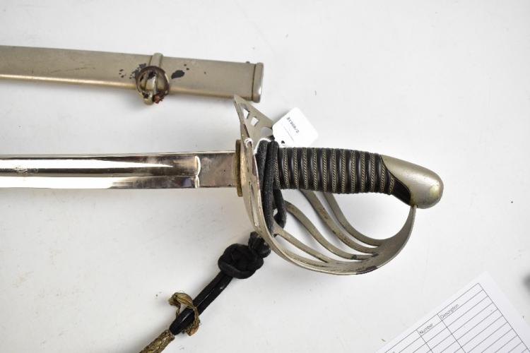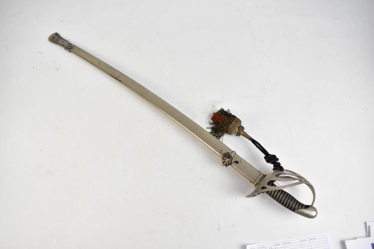 Lot 54A of 679: YZERHOUWER; a Dutch M1912 officer's parade sabre with etched inscription 'Nederl. Wapermagazy Haarlem' and stamped W K & G to base, length 78cm, to nickel plated engraved and pierced guard with silver bullion wire-work ribbed grip, with silver bullion 'knot' and tassels, in metal scabbard.
