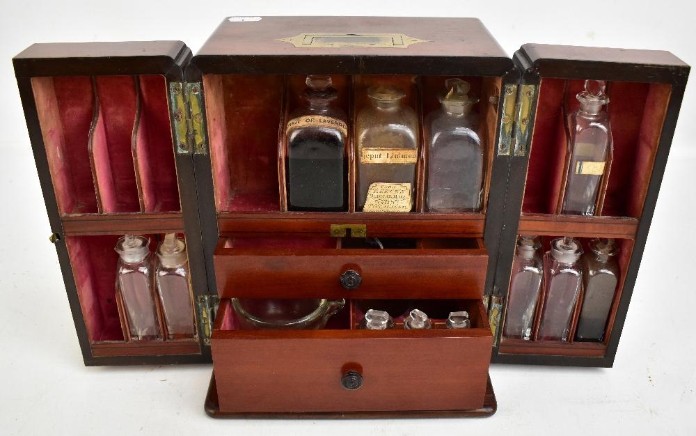 Lot 2 of 922: An early 19th century mahogany cased apothecary cabinet, the two hinged doors enclosing a part fitted interior including nine bottles above two base drawers enclosing three further bottles and measuring jar, with back opening slide containing four further bottles, height of case 27cm, width 22cm, depth 18cm.