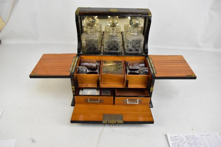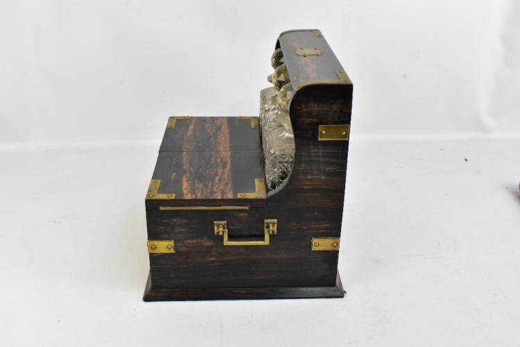 Lot 7 of 922: A 19th century brass bound coromandel tantalus/gaming box housing three hobnail cut glass decanters, with pull-down front enclosing fitted interior and two baize drawers containing playing cards, with Bramah lock, height 35cm, width 36cm, depth 32cm.