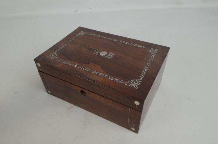 Lot 29 of 922: A Victorian rosewood sewing box with mother of pearl floral detail and hinged cover enclosing a fitted compartment, length 28cm, together with four pieces of reproduction doll's house furniture (5).