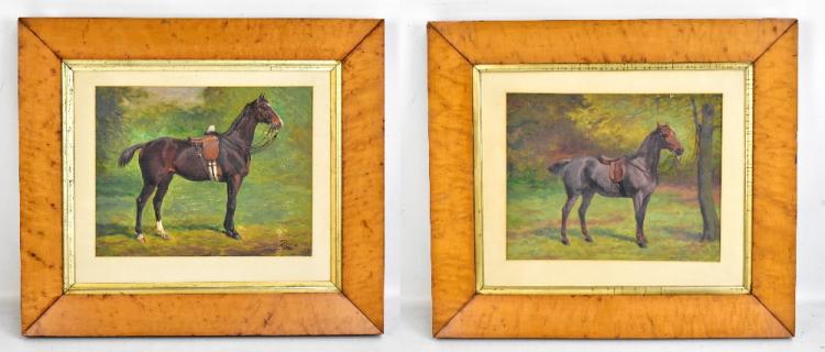 Lot 359 of 922: LEWIS-MAY; a pair of oils on canvas, horse studies, one signed and dated 1909 lower right, 25.5 x 32.5cm, glazed in birds eye maple frames (2).
