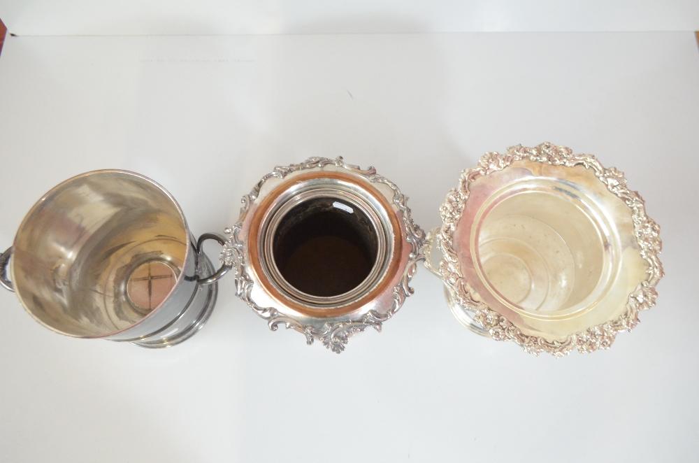 Lot 550 of 922: Three silver plated ice buckets including a Reed & Barton twin handled example with banded Greek key decoration, height 22cm, and two urn shaped examples with cast decoration.