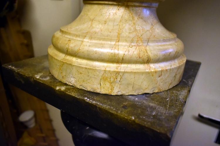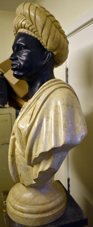 Lot 704 of 922: A reproduction Italian carved marble and black slate bust of a blackamoor figure, raised on column plinth, overall height 197cm.