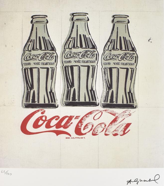 Lot 10 of 1719: AFTER ANDY WARHOL; lithograph on wove Arches paper with deckled edges, ‘Coca-Cola’ (c. 1980s), printed signature to stone, no. 62/100, pub. Georges Israel (blind stamp recto) and Leo Castelli Gallery New York (stamp verso), the image 33 x 32cm, the sheet 56.4 x 38.2cm, loose.