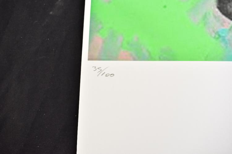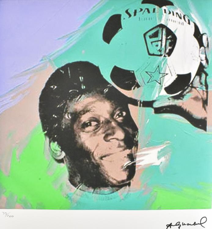 Lot 11 of 1719: AFTER ANDY WARHOL; lithograph on wove Arches paper with deckled edges, ‘Pelé from the ‘Athletes’ series (1978), printed signature to stone, no. 35/100, pub. Georges Israel (blind stamp recto) and Leo Castelli Gallery New York (stamp verso), the image 37.5 x 37.5cm, the sheet 56.2 x 38.2cm, loose.