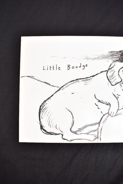 Lot 13 of 1719: AFTER DAVID HOCKNEY; lithograph on card, ‘Little Boodge’ (1993), small poster depicting the artist’s dog, with printed initials and date ’93 to stone, with further printed detail for 1853 Gallery, Salts Mill, Saltaire, Yorkshire verso, 28 x 42cm, loose.