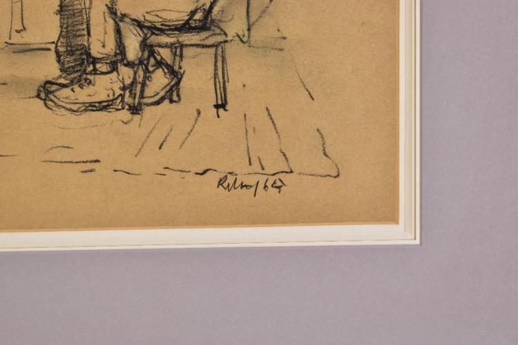 Lot 47 of 1719: HAROLD RILEY DL, DLitt, FRCS, DFA, ATC (born 1934); crayon heightened with colour, The Cobbler, signed and dated 64, 30.5 x 23.5cm, framed and glazed. (D) Provenance: Private Collection London. The Mrs Westwall Collection.