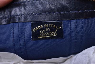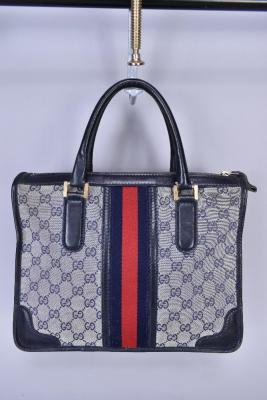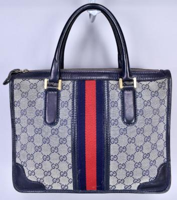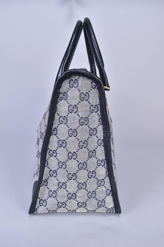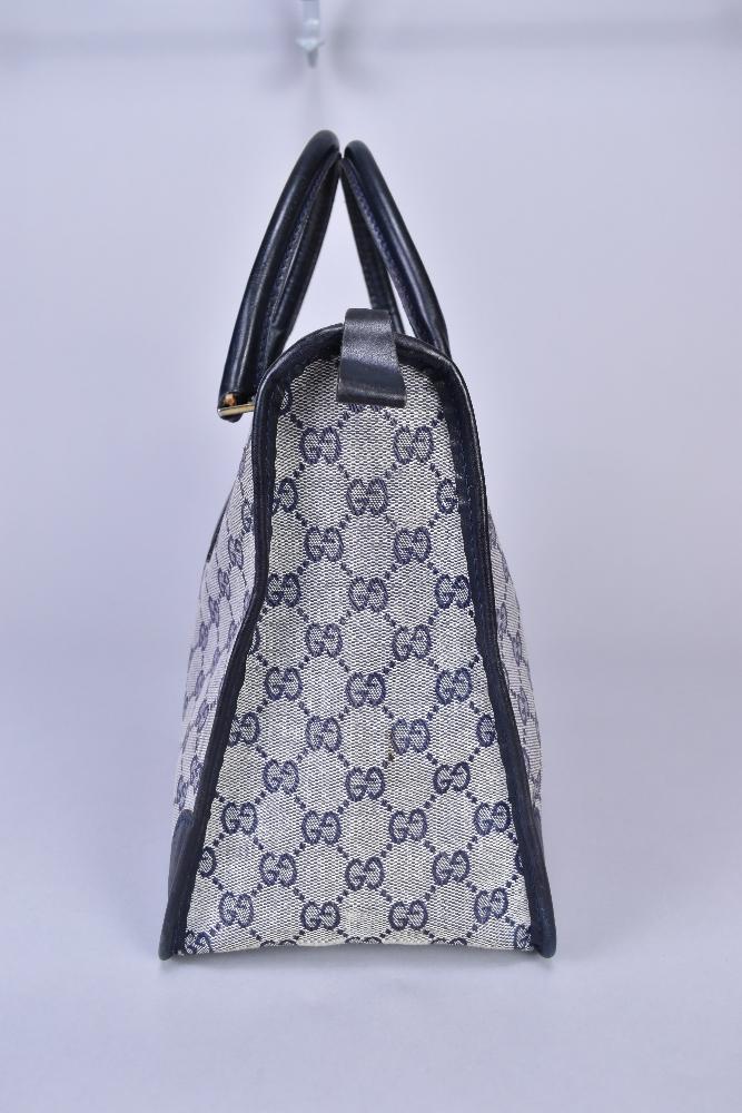 Lot 1040 of 1719: GUCCI; a GG monogram canvas and navy blue leather Boston style handbag, 32 x 25 x 15cm.