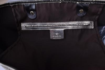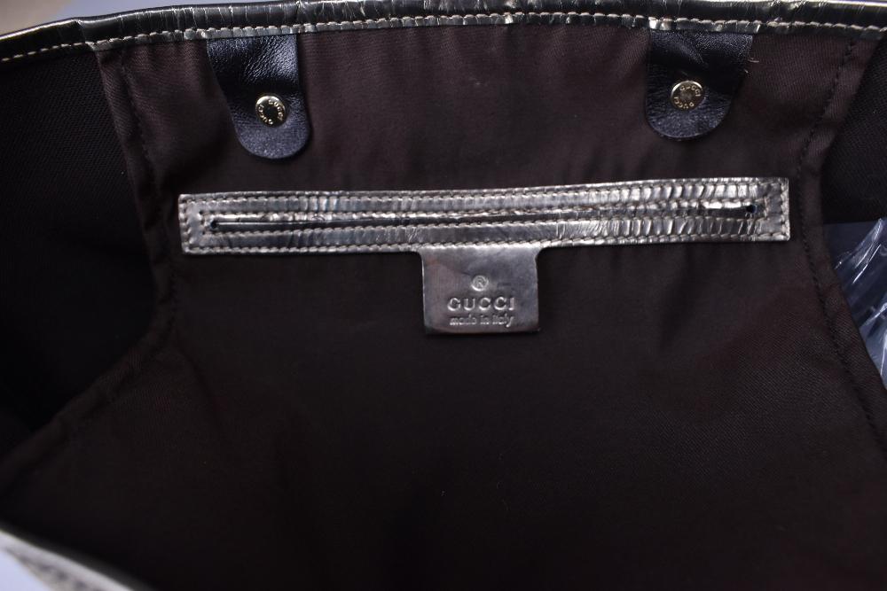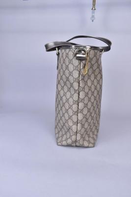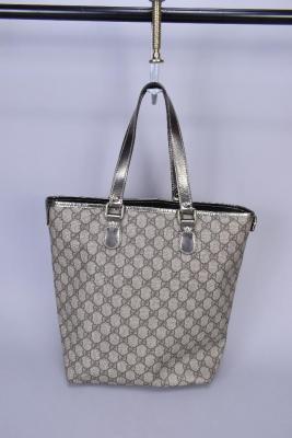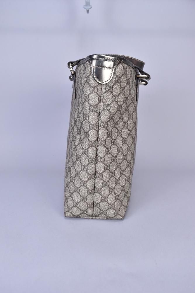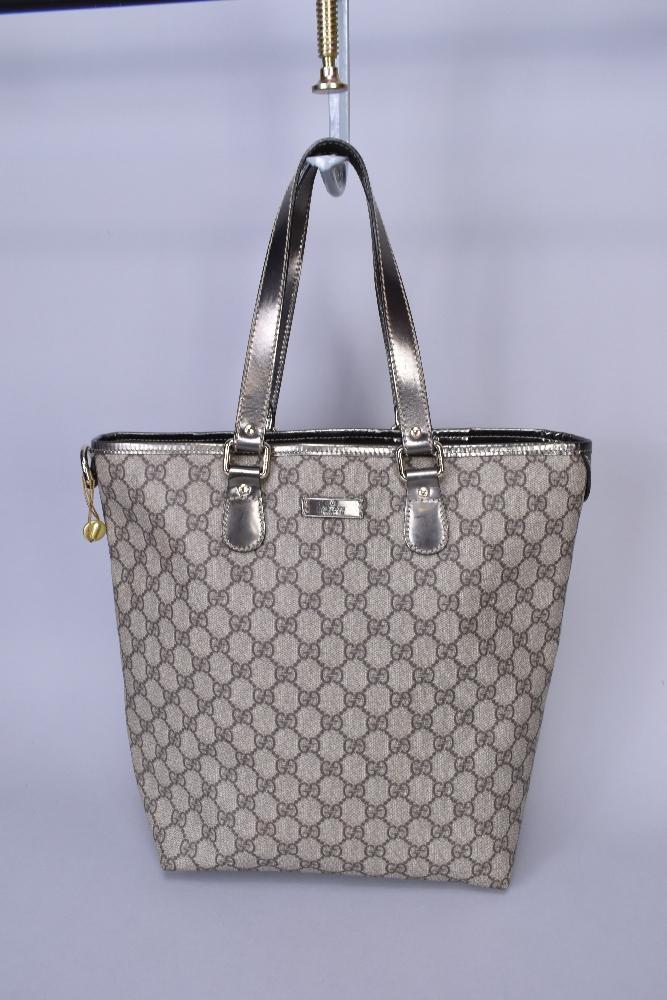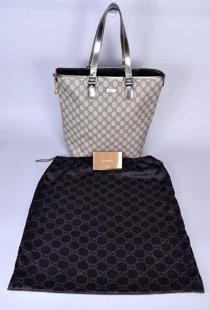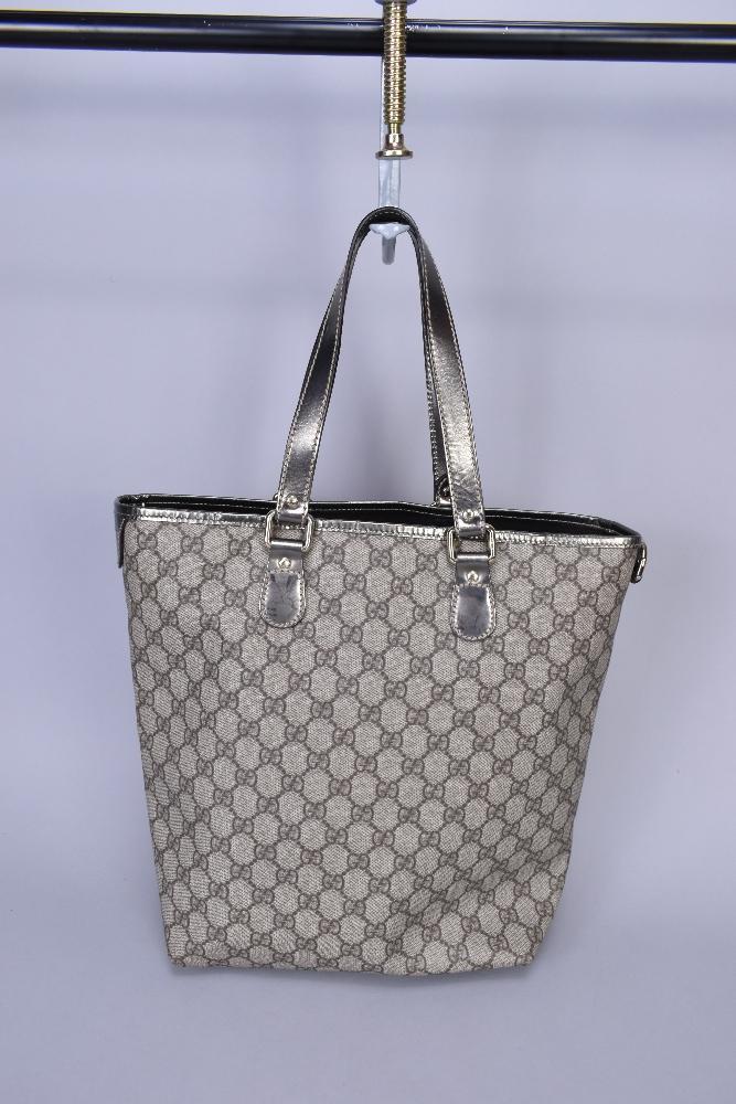 Lot 1043 of 1719: GUCCI; a beige and brown canvas and leather bag with GG Gucci monogrammed print code 189896, 30 x 25 x 10cm, with original dust bag.