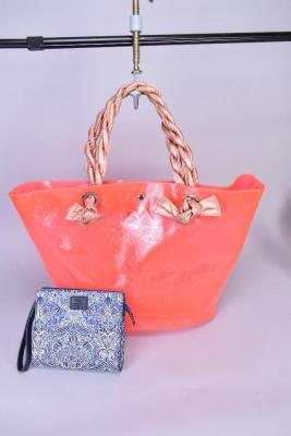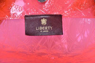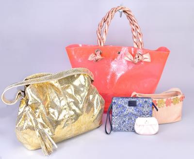 Lot 1045 of 1719: LIBERTY OF LONDON; an Ianthe Tana Lawn embossed pink plastic tote bag, a Liberty toilet bag, a Liberty pink canvas flower handbag, a gold handbag and a Pringle satin purse (5).