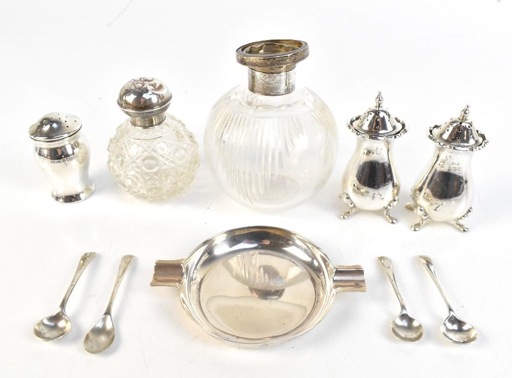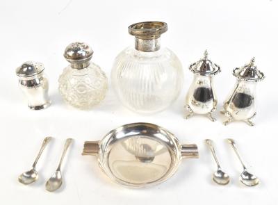 Lot 1579 of 1719: NAYLER BROTHERS; a George VI hallmarked silver ashtray of circular form, London 1950, and further hallmarked silver including a pair of pepperettes, four mustard spoons, two dressing table bottles etc, weighable silver approx 6.7ozt/209g (10).