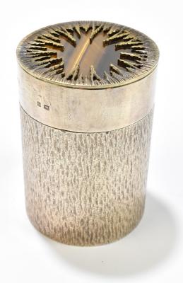 Lot 1588 of 1719: MAPPIN & WEBB; an Elizabeth II hallmarked silver cylindrical box and cover with textured detail, the cover with tiger’s eye panel, Birmingham 1973, fitted in original box, height 9.5cm, diameter 5.5cm.