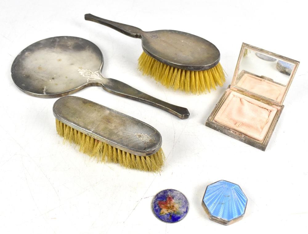 Lot 1600 of 1719: ADIE BROS LTD; a George V hallmarked silver and guilloche enamel compact of octagonal form with sunburst decoration, diameter 4cm, a further white metal compact with engine turned decoration, a three piece hallmarked silver dressing table set, etc (6).